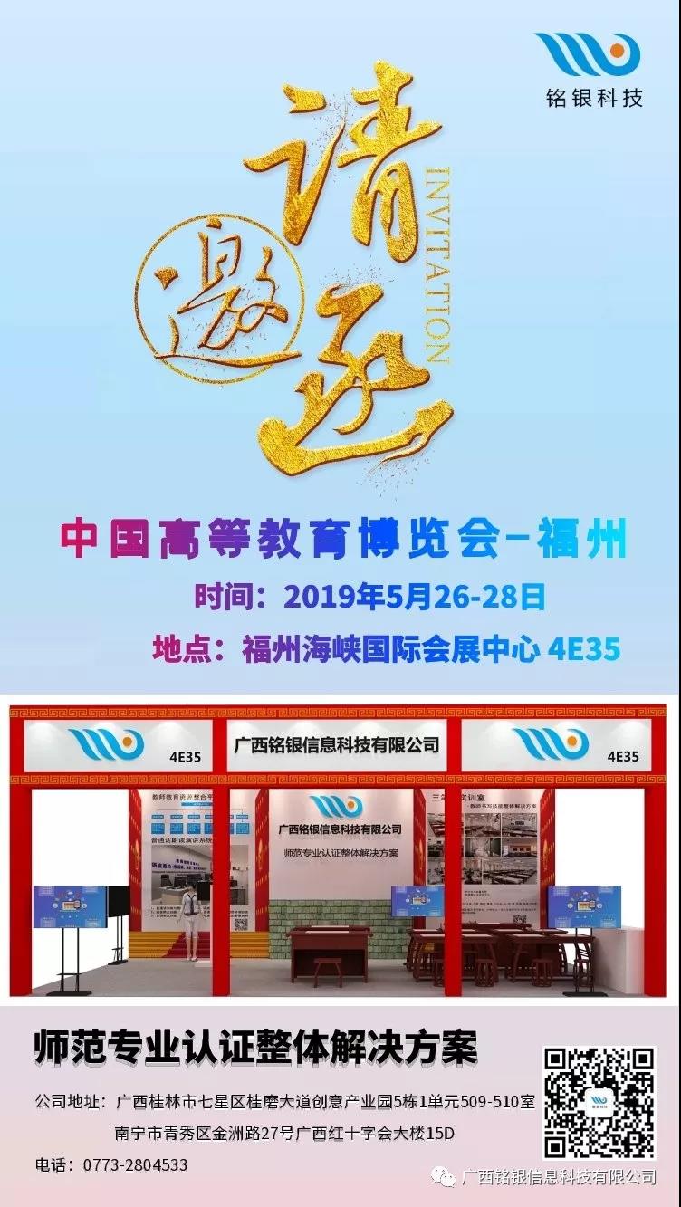 中国高等教育博览会-福州站将于2019年5月26日-28日在福州海峡国际会展中心举行。此次展会,铭银科技将以三笔字系统、普通话朗读演讲系统、教师教育资源整合平台等师范专业认证整体解决方案亮相。