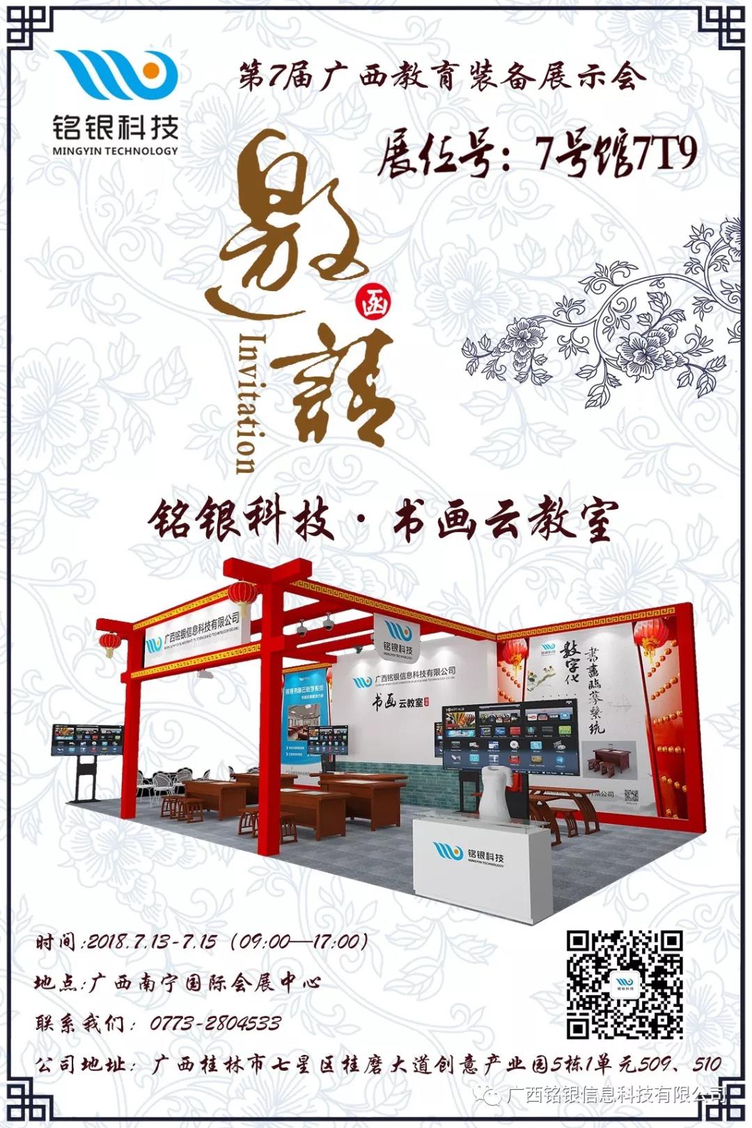 第7届广西教育装备展示会将于2018年7月13-15日在广西南宁国际会展中心举行。此次展会,铭银科技将以数字书画临摹台、书画云教室、书画教室整体解决方案亮相。铭银科技诚邀您拨冗莅临!