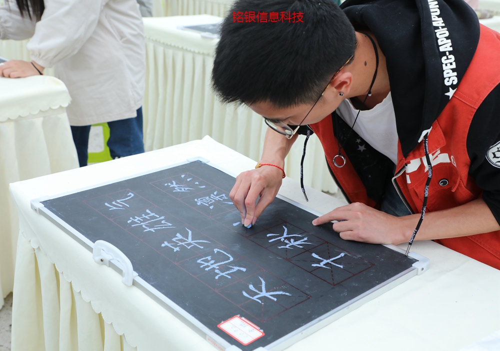 总决赛分为毛笔书法、钢笔书法、粉笔书法三个比赛项目,来自各学院的500名参赛选手从2300多名初赛选手中脱颖而出,进行最后的角逐。活动现场,500张桌椅摆放整齐,场面恢弘。在清脆的口令声中,比赛正式开始,参赛选手凝神端坐,奋笔疾书,挥毫泼墨,钢笔字遒劲有力,毛笔字行云流水,粉笔字刚劲潇洒,笔墨飞舞间,一幅幅或清新飘逸或苍劲有力的作品展现在眼前。师大学子以笔墨舒青年豪情,以横竖绘青春壮志,充分展现了师大青年积极向上的青春风貌。
