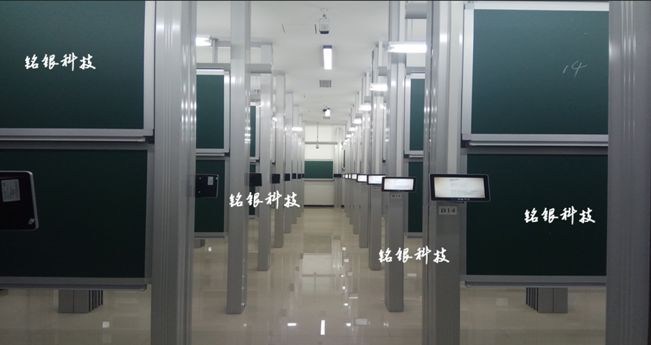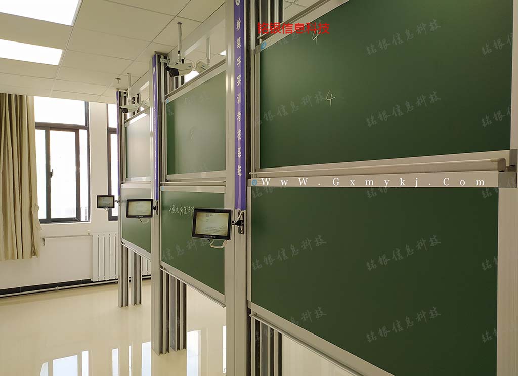 2、“粉笔板书实训室”:采用两机位高清摄像机完整的拍摄教师的书写黑板,由三笔字系统同步传输到所有学生位的粉笔实训终端设备上,学生实训黑板则采用上下推拉式组合黑板,由此既实现的粉笔板书的真实书写训练又解决了因为教室部局而影响教师粉笔板书教学的难题。通过学生位的互动考核摄像机实现学生真实粉笔板书实训的拍摄和作品记录。